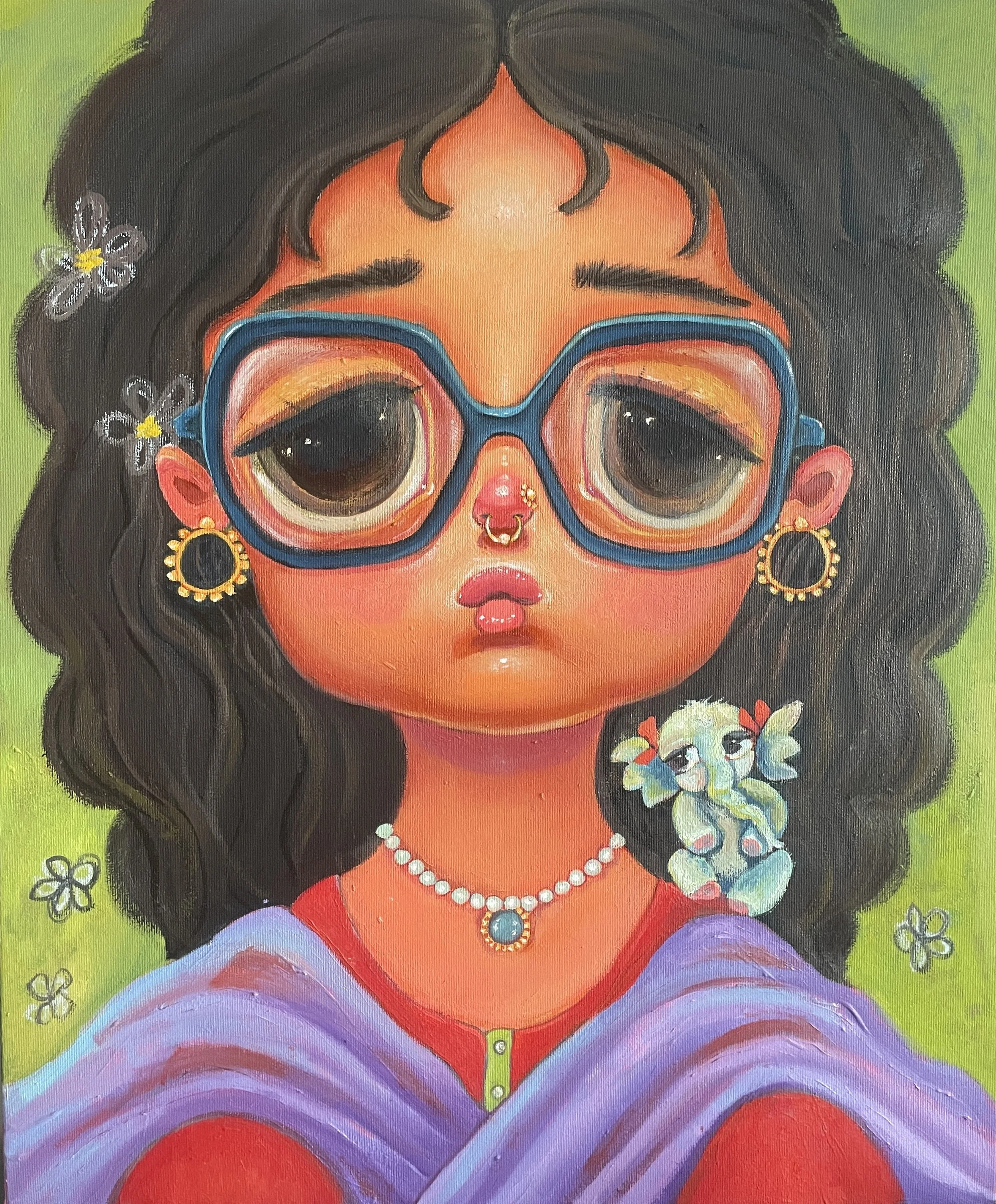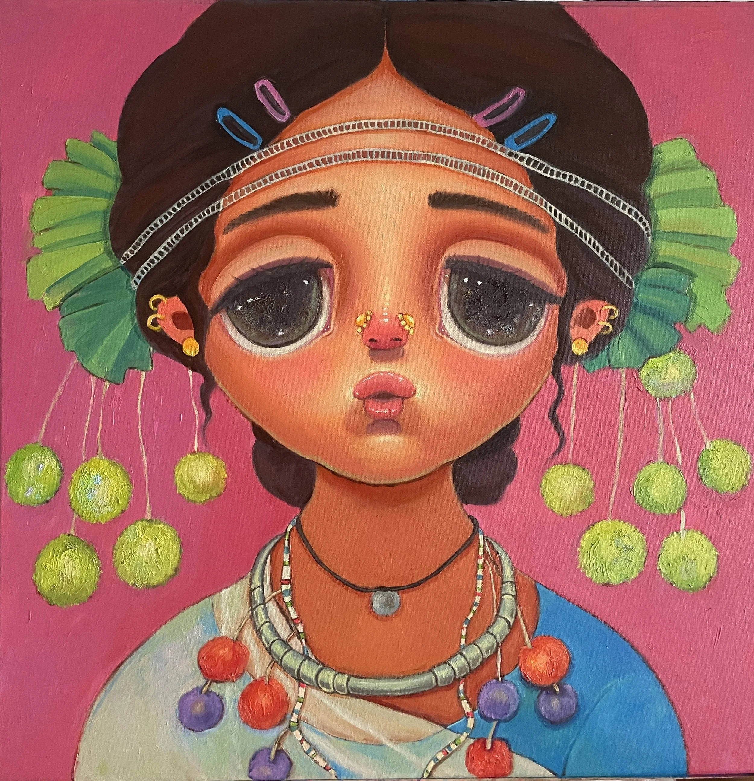 Colorful portrait painting of a young girl with large eyes, dark hair, wearing traditional jewelry and green clothing, set against a yellow background